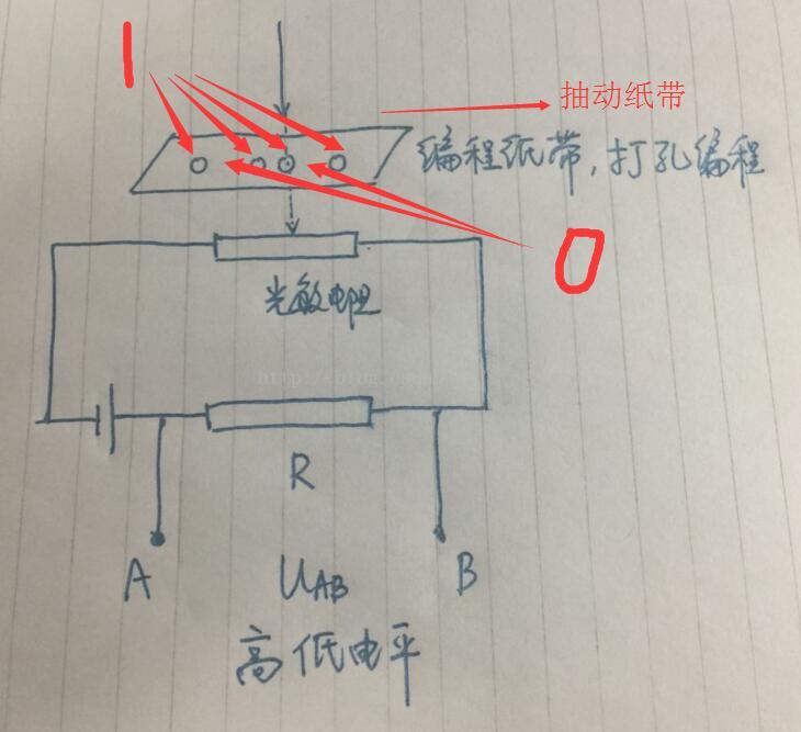 计算机先驱们玩纸带编程, 不一定是通过光敏电阻来玩的, 但无疑, 光敏电阻可以实现纸带打孔编程。 上图就是纸带编程的原理, 通过纸带上的有孔(表示1)和无孔(表示0)来控制电路电压/电流, 让电路电压/电流完成计算(本质就是搬弄一堆开关而已), 怎么计算的呢? 想想与非或三门吧, 然后就知道了半加器, 全加器, 集成电路, cpu......
