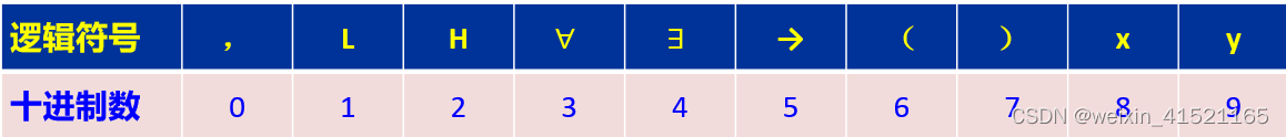 按照哥德尔的思想,假设符号与十进制数的编码如下: