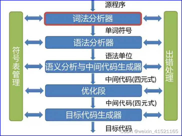 源程序→预处理→词法分析→语法分析→语义分析→生成中间代码→代码优化→生成目标程序→程序连接→生成可执行程序。