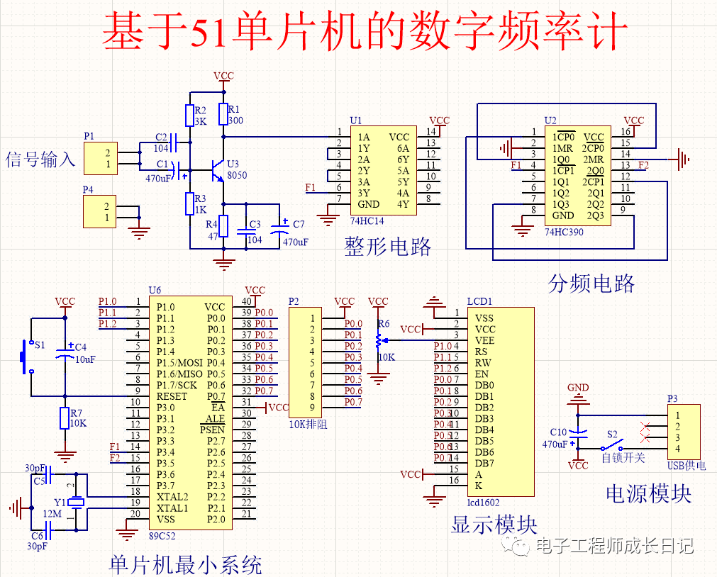 系统由STC89C52单片机+信号输入+74HC14整形电路+74HC390分频电路+LCD1602显示模块+电源构成。