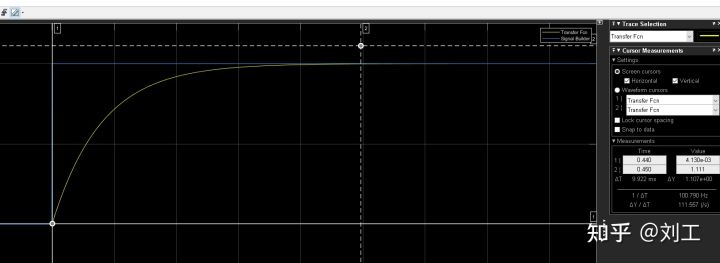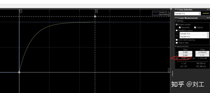 上升时间为5ms。从上述的实验可以得一个结论,一阶惯性环节阶跃信号输出响应,对应的信号上升时间可以用来反向计算一阶滤波器的带宽。