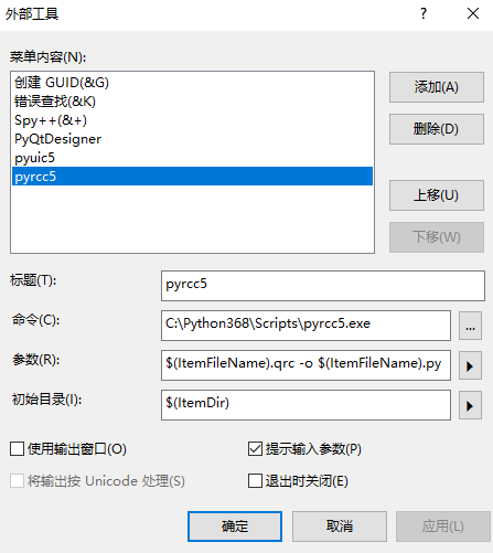 参数:$(ItemFileName).qrc -o $(ItemFileName).py