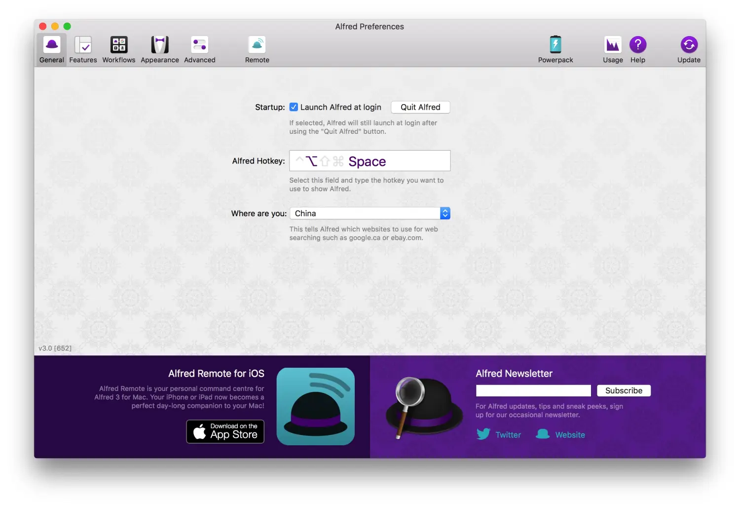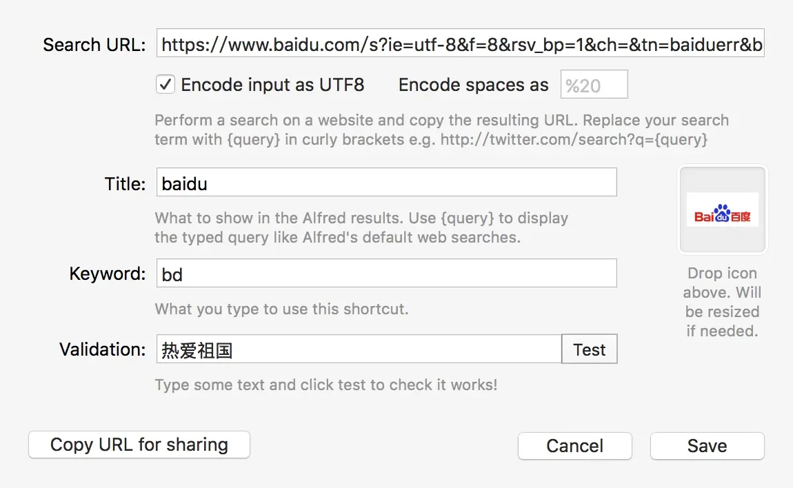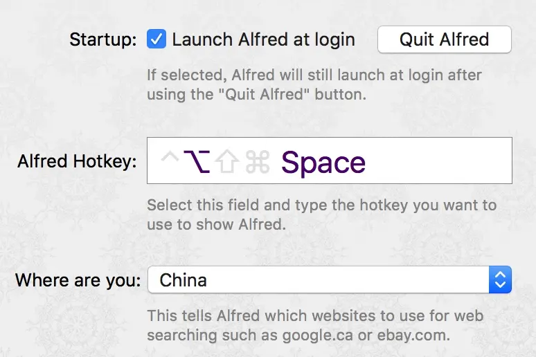 Alt + 空格。 - Where are you:你在哪个国家。Alfred内置了常用网站搜索功能,在搜索时打开对应国家的网站。