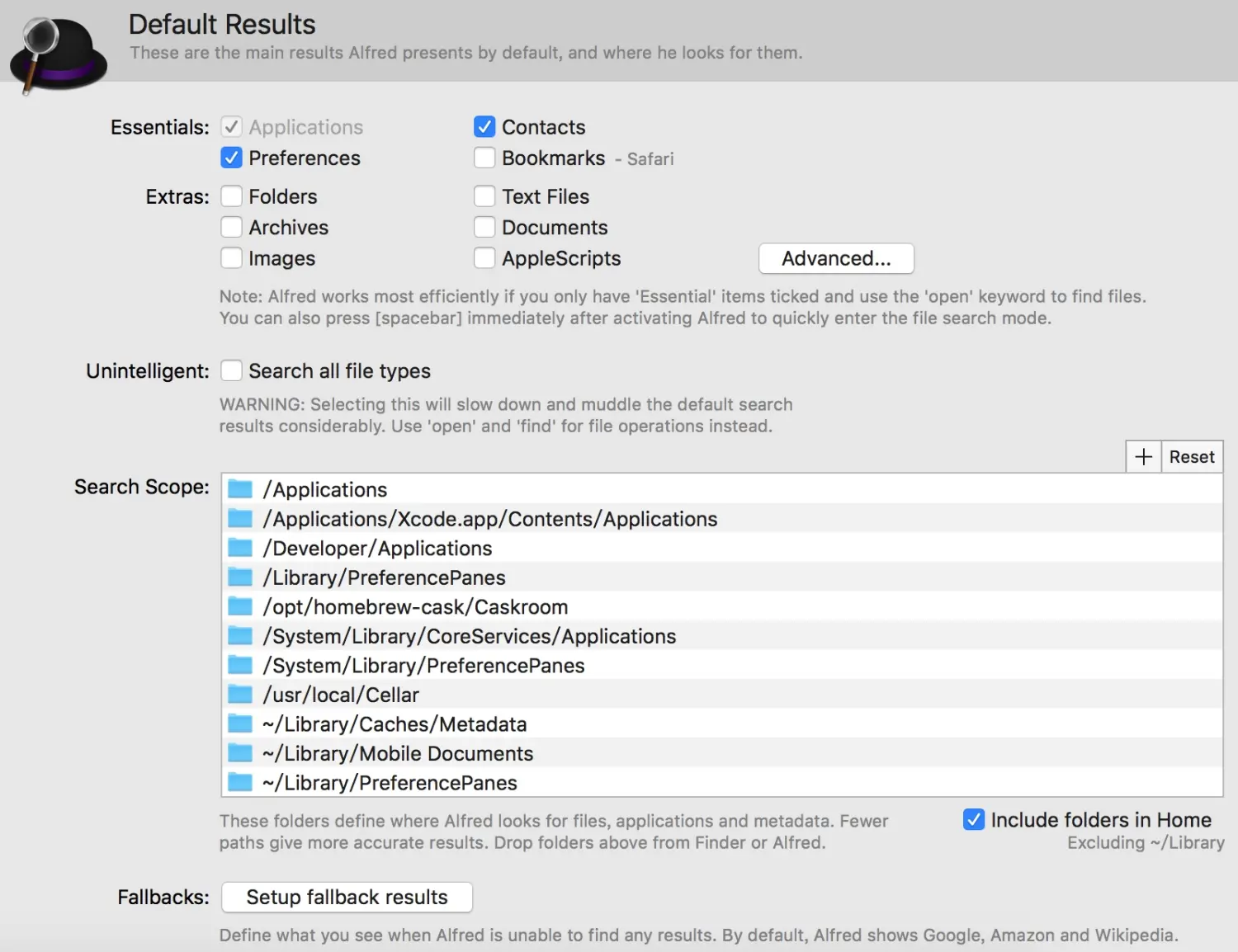 Extras:可设置搜索“文件夹”、“文本文件”、“压缩文件”、“个人文档目录”、“图片”、“AppleScript”等其他文件。