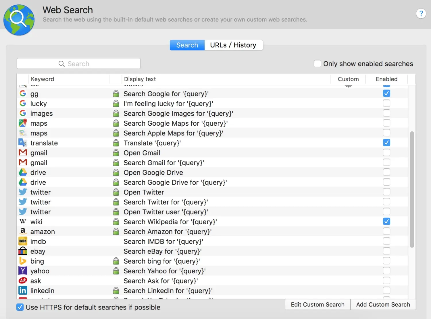 Keyword为Alfred命令/关键字;DisplayText为此搜索功能的标题;Custom有图标表示这个为用户自定义;Enabled为是否启用。