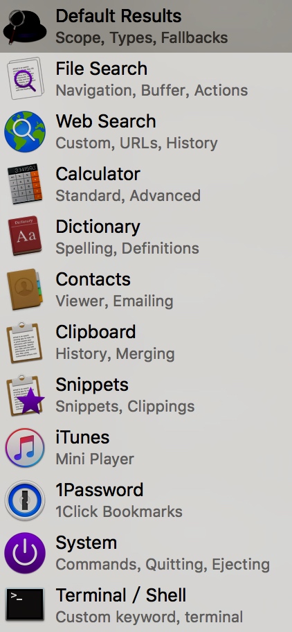 Features包含的所有功能,本文不打算讲解所有的功能,只讲解最常用的。如:Default Results、File Search、Web Search、Calculator等。