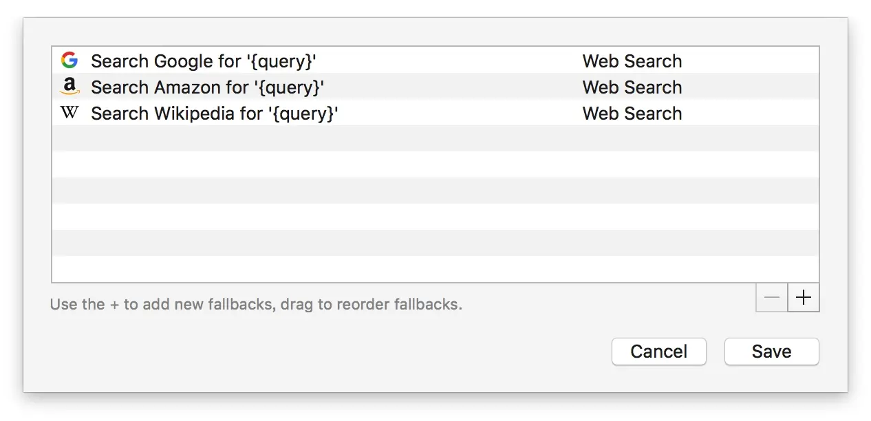 Fallbacks:若上面的查询搜索不到结果时,就会调用这里设置的网站或搜索引擎来进行进一步的查询。默认反馈结果为Google、Amazon、Wikipedia网页搜索。