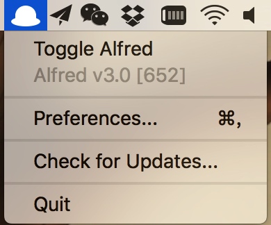 Alfred启动后,在Mac上方菜单栏上会有其图标,左键点击后选择