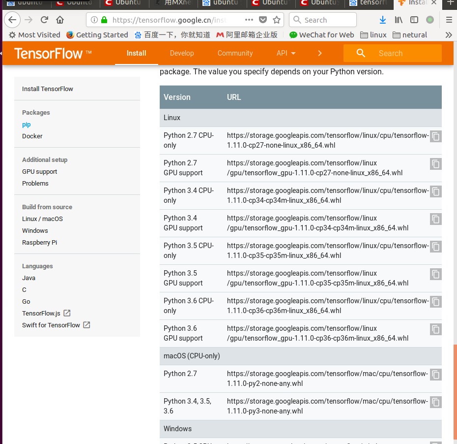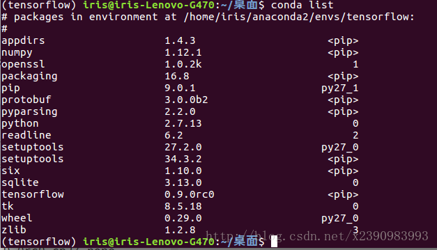 下载tensorflow(这里是1.0.1,python2.7版,gpu)执行安装命令并查看安装好之后tensorflow环境里面有哪些安装包,具体版本可以去官网查找自己需要的,如下图