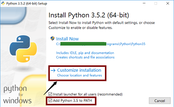在下图红色标记的地方Add Python3.5 to PATH前勾选,可以直接将python3添加到系统环境变量,然后在Customize installation中自定义安装路径。