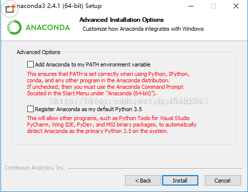 4. 如图2。这里取消掉那两个勾(按照字面意思理解,打上第二个勾应该是没有影响的。至于第一个选项,由于之前已经把Anaconda2添加到系统PATH路径下了,因此再把Anaconda3添加进去,由于顺序在Anaconda2的后面,几乎是没有作用的,所以这里没有勾上)。