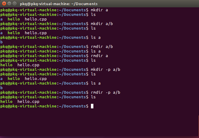 mkdir创建文件夹, rmdir 删除文件夹, 当加上-p 就是可以创建与删除 与父目录同等的创建与删除,下面就是个例子。