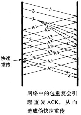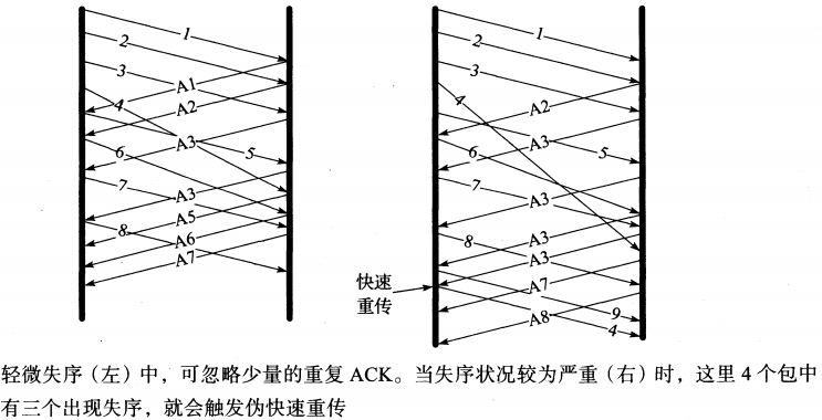 - 当失序程度不是很大(如两个相邻的包交换顺序),这种情况可以迅速得到处理。反之,当出现严重失序时,TCP会误认为数据已经丢失。这就会导致伪重传,主要来自快速重传算法