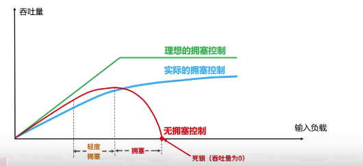 刚开始时,吞吐量等于网络输入的负载,所以曲线呈45度上升,随着网络输入负载的增多超过某一限度时。由于网络资源受限,吞吐量不再增长而保持水平线,也就是吞吐量达到饱和。同时也说明输入的负载有一部分丢失掉了(在分组的丢失使拥塞的预兆),例如输入到网络中的某些分组被某个节点丢弃了,虽然如此在理想的拥塞控制下,网络的吞吐量维持到可达到的最大值。