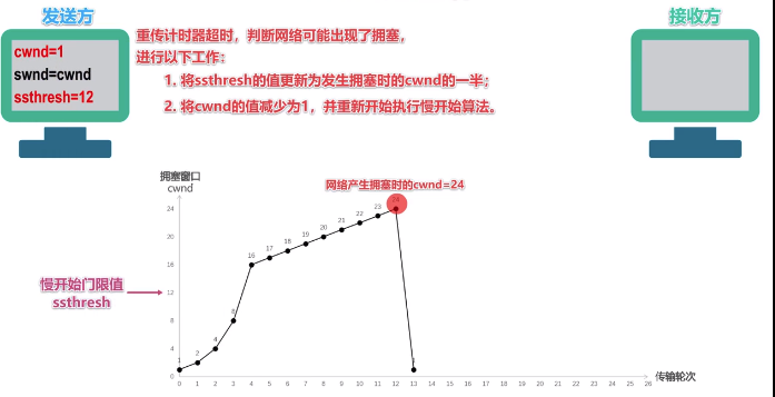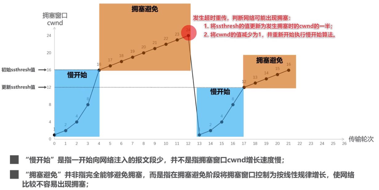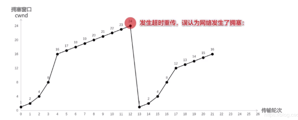 直到发送方接受到的报文段小于自身发送的报文时,报文中途丢失了,重传计时器超时,这个时间则会判断出现了拥塞。