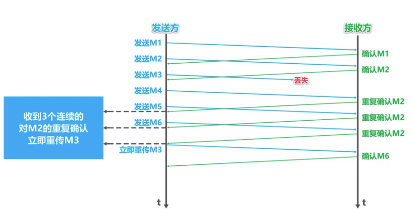 - 发送方一旦收到三个连续的重复确认,就将相应的报文段立即重传,而不是等待该报文段的超时重传计时器超时再重传。