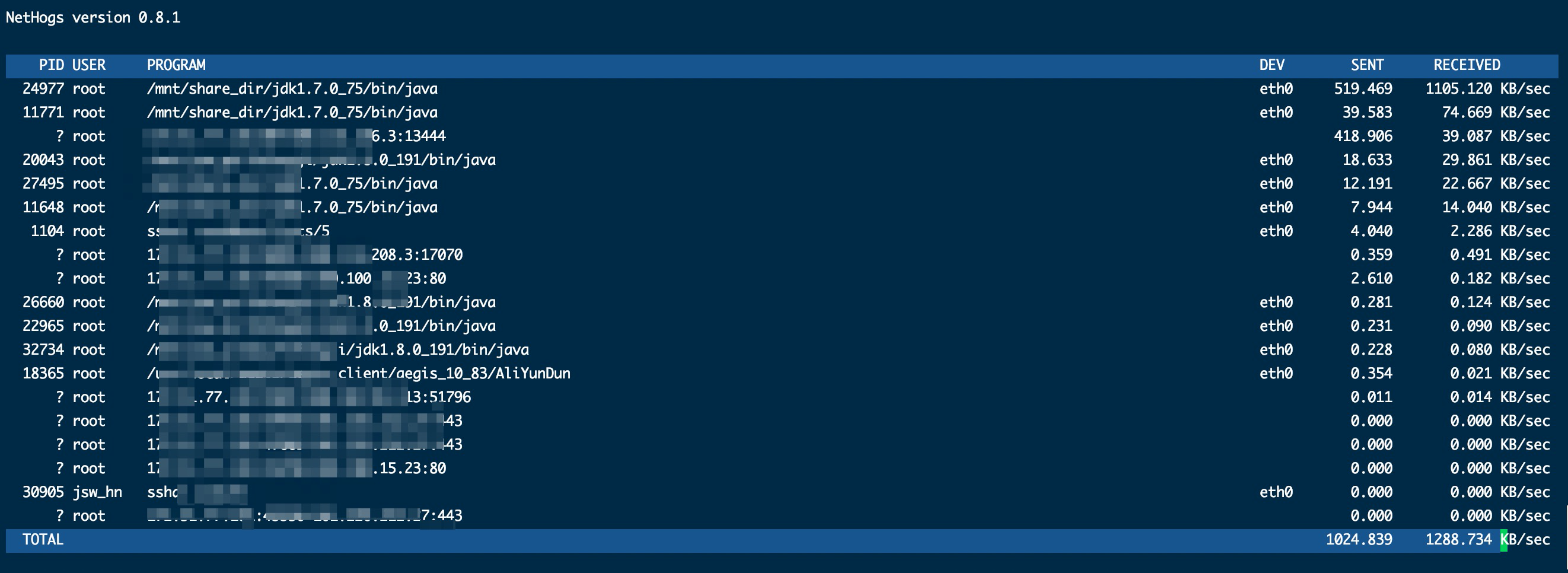 3、同时监视eth0和eth1接口 : nethogs eth0 eth1