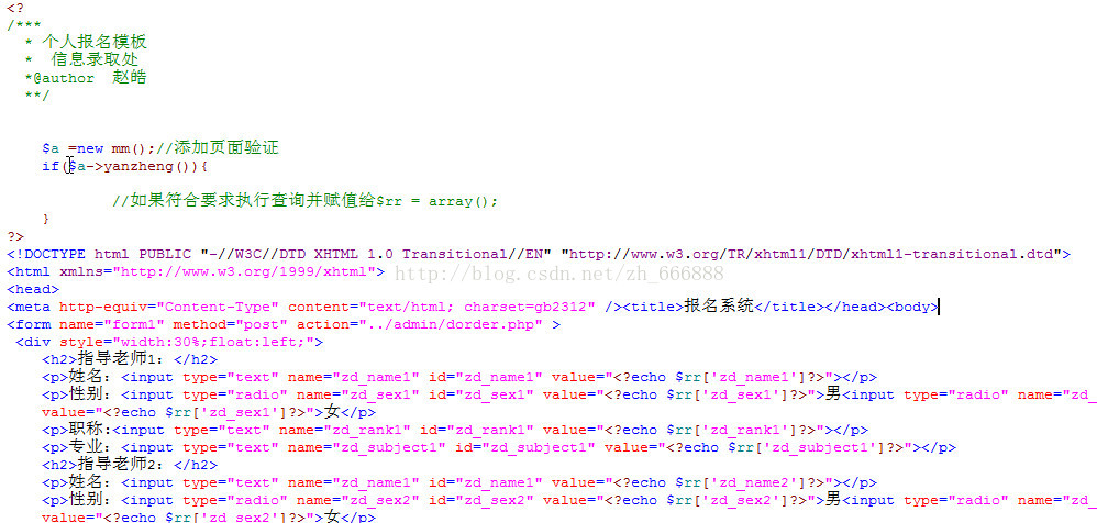 第一步要执行验证,只有确认用户登录后台才可以执行数据查询,将取出的值赋给数组$rr,第二步,后面的html和php混合的页面则会显示报名者的详细信息,第三步,要在最后<input type="submit" value="提交">时,如果是后台登陆用户,则不显示,这样报名者可以当做报名表单来提交个人情况,而后台管理者则可以当做详情页面,来查看某一位的报名情况。