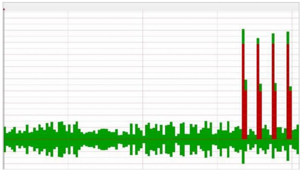 很多攻击持续的时间非常短,通常5分钟以内,流量图上表现为突刺状的脉冲。