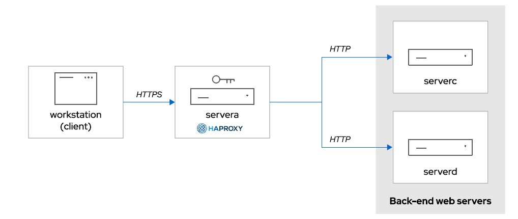 在本练习中,将HAProxy部署在servera上,在serverc和serverd上运行的两个web服务器之间分配web流量。还可以将HAProxy配置为HTTPS终止程序。