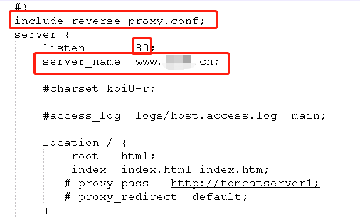 核心nginx监听80端口,server_name为其中一个服务对应的域名。其中包含的reverse_proxy.conf配置如下: