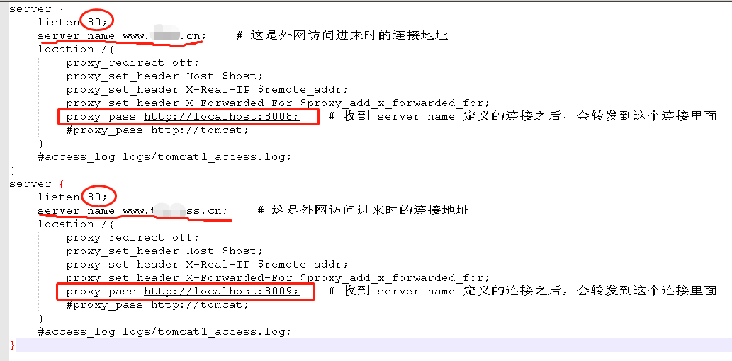 这两个server监听的都是80端口,因为域名直接访问默认的是80端口。这边的代理会根据访问的实际域名进行相应的内网转发,不同的域名转发到不同的内网端口上。
