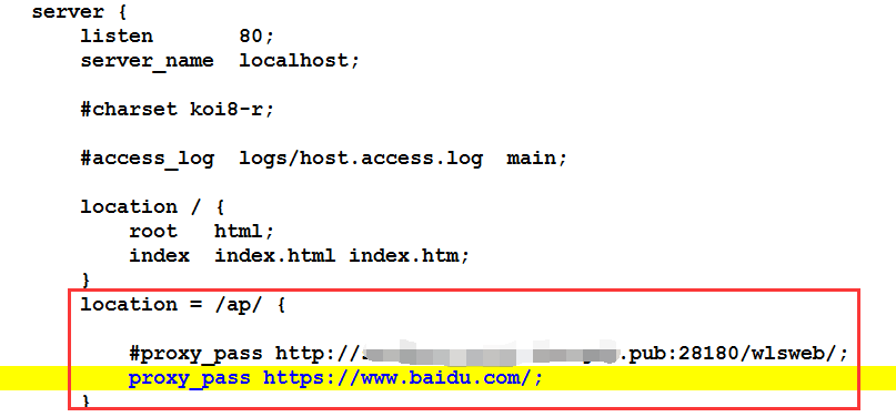 首先在本地启动nginx【即在nginx根目录双击nginx.exe ,可以在任务管理器中查看是否有nginx.exe进程,如果有说明开启成功】,然后根据上图中的location,在浏览器访问http://localhost/ap/ 【因为是本地且server_name = localhost,如果是在远程服务器使用nginx,则localhost改为服务器对应的域名或ip地址】,会请求转发到百度的首页。如果是想访问到上图中http://XXXX.pub:20180/wlsweb, 则需要修改配置location = /ap/wlsweb/ 或location /ap/wlsweb/【经我自行测试 = 可有可不有】。且后面的/不能省去。注意修改完配置文件,关闭nginx的进程,重新启动nginx,配置爱文件才会重新加载生效。最后说一点,对应nginx的启动和关闭也有想过命令,有兴趣的可以网上查询相关命令进行操作。