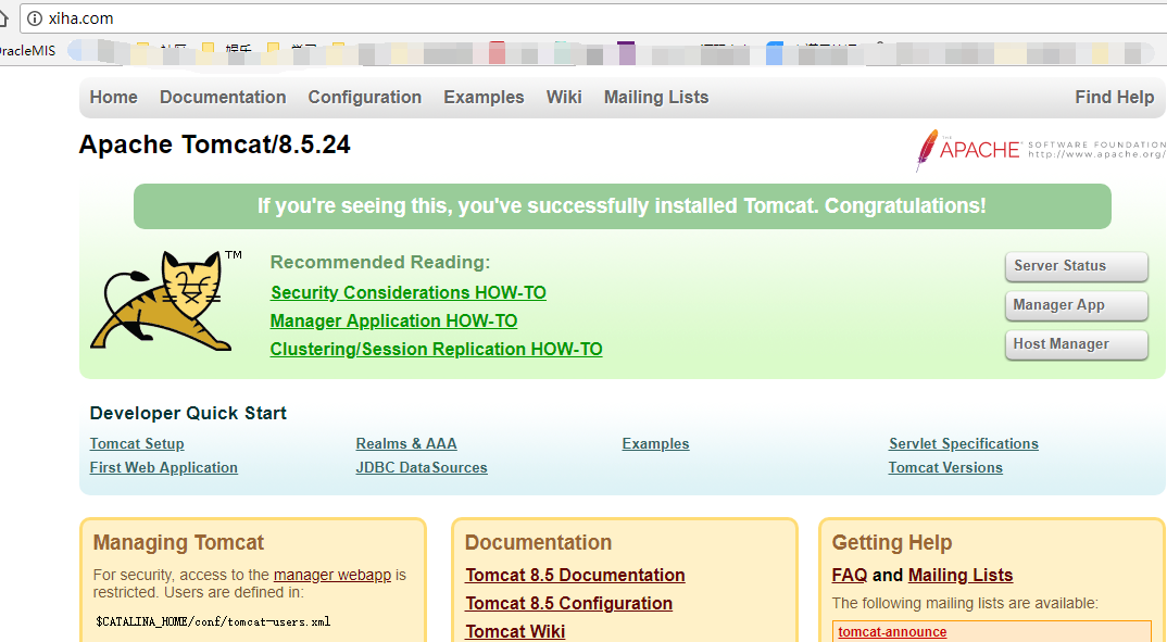 10.23.57.227:8080,成功访问到tomcat页面,因为我本地端口8080是对应的Tomcat,因此要确保tomcat服务启动。见下图,成功访问到Tomcat。当你出现不同的错误的时候,要去看目录logs文件夹下error.log文件中的内容。