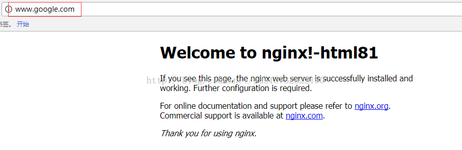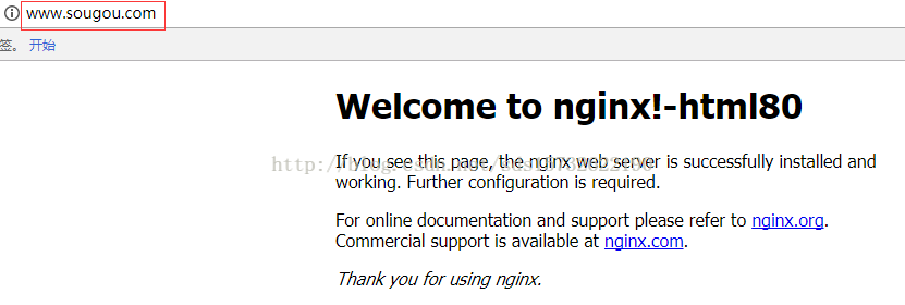现在,打开浏览器,输入http://www.sougou.com即可访问html80文件夹的内容,输入http://www.google.com可访问html81文件夹的内容,此时监听的端口都是80。这种方式是配置tomcat反向代理的基础。(做此测试需要在hosts 文件中配置这两个域名的DNS映射ip,均指向nginx服务器ip)。
