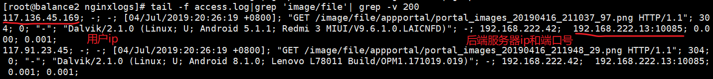[root@balance2 nginxlogs]# tail -f access.log|grep 'image/file'| grep -v 200