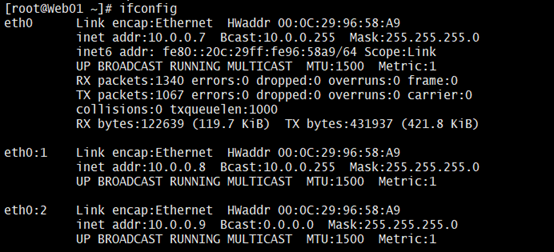 ip addr add 10.0.0.9/24 label eth0:2 dev eth0(使用ifconfig和ipaddr都能查看,推荐使用)