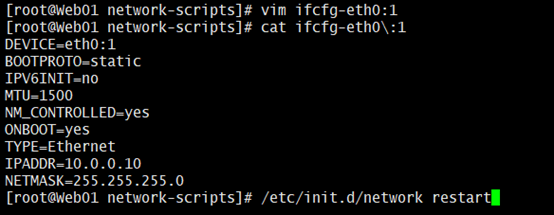 cd /etc/sysconfig/network-scripts/ #进入到网卡配置文件的目录 cp ifcfg-eth0 ifcfg-eth0:1 #拷贝配置文件并重命名 vim ifcfg-eth0:1 #编辑配置文件 /etc/init.d/network restart #重启网络服务