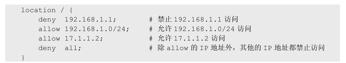 举个例子,对访问某个 location块的 IP地址进行限制,代码如下: