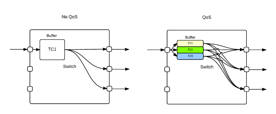 QoS是一种机制,它给一个网络流赋予一个优先级,并且管理它的最低需求(guarantees),极限能力(limitations)和它相比其他网络流的优先级服务。这是通过一个2/3阶段的过程将用户层的优先级映射到一个硬件层流量类(hardware Traffic Class)上实现的。流量类被赋予QoS属性(缓存分配,流控制,排队,调度,随机早期检测,显式拥塞通知等等),并且不同的流按照这些对应的属性被服务。
