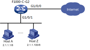 # 在接口Gigabitethernet1/0/0上对源地址属于IP地址段2.1.1.0 24位掩码内所有PC进行限速。