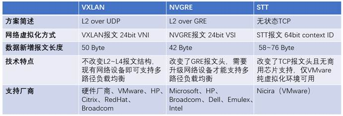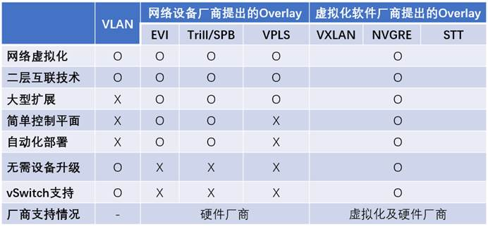 通过表1,我们可以看到这几种Overlay技术对比。 其中,虚拟化软件厂商提出的Overlay技术由于天然支持vSwitch,在云计算网络中更有优势。