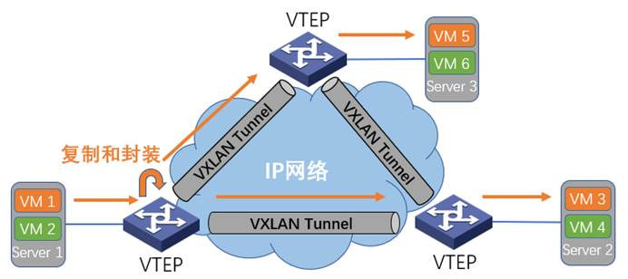 在头端复制方式下,VTEP负责复制报文,采用单播方式将复制后的报文通过本地接口发送给本地站点,并通过VXLAN隧道发送给VXLAN内的所有远端VTEP。