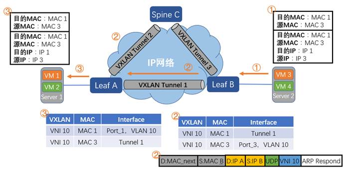 3. Leaf B发现ARP应答报文是一个单播报文,其目的MAC是MAC 1,于是在VXLAN 10中查找。发现MAC 1的条目存在,其对应的端口为VXLAN Tunnel 1,于是把原始报文进行VXLAN封装。最外层是以太网头,接着是IP头,其中源IP是Leaf B的IP,目的IP是Leaf A的IP。再往内是UDP头和VXLAN头,其中VNI为10。最内层是VM 3的ARP应答报文。