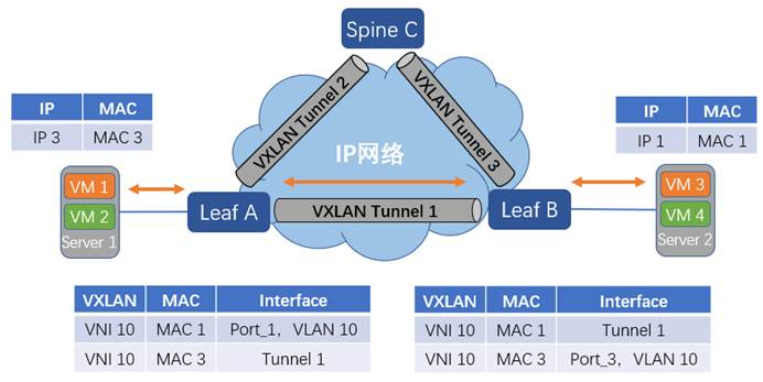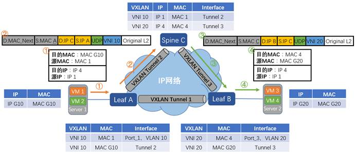 2. Leaf A收到VM 1发来的报文,识别此报文属于VXLAN 10,查找目的MAC G10的表项,就报文进行VXLAN封装后从Tunnel 2发送出去。其中,VXLAN头中的VNI为10;外层源IP地址为Leaf A的IP,外层目的IP地址为Spine C的IP;外层源MAC地址为Leaf A的MAC,而外层目的MAC地址为去往目的IP的网络中下一跳设备的MAC地址。封装后的报文,根据外层MAC和IP信息,在IP网络中进行传输,直至到达对端VTEP。