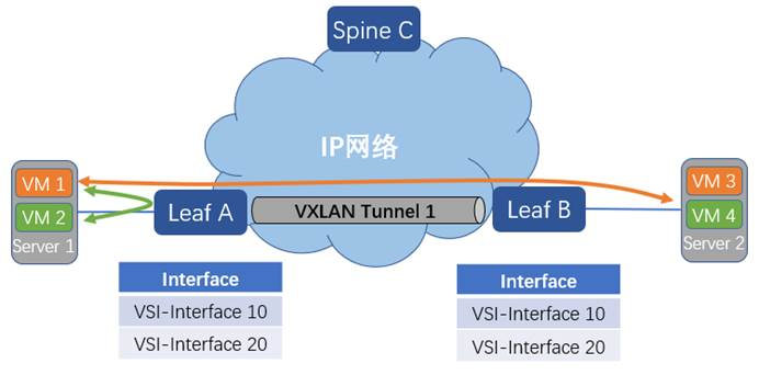 集中式网关,即网关都集中在Spine设备。如图10所示,VSI-interface 10和VSI-interface 20都在Spine C设备上。所有跨VXLAN的流量,VXLAN与非VXLAN的互访流量都需要经过Spine。如图10中VM 1访问VM 4时,需要通过Spine设备,并经过两段VXLAN Tunnel,即VXLAN Tunnel 2和VXLAN Tunnel 3。而VM 1访问VM 2,也需要绕行Spine设备,同样需要历经从A到C和从C到A两次VXLAN封装。
