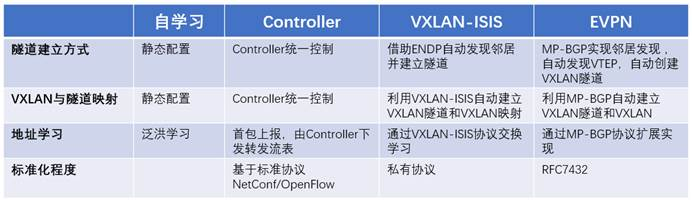 通过表2,可以看到VXLAN、NVGRE、STT这三种技术的区别。 与NVGRE相比,VXLAN不需要改变报文结构即可支持L2~L4的链路负载均衡;与STT相比,VXLAN不需要修改传输层结构,与传统网络设备完美兼容。由此,VXLAN脱颖而出,成为了SDN环境下的主流Overlay技术。