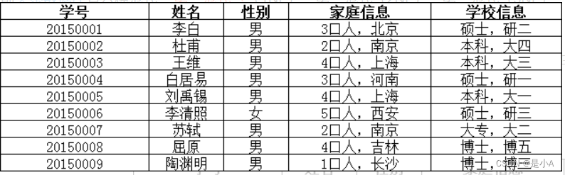 表中 家庭信息 和 学校信息 列都不满足原子性的要求,即不满足第一范式