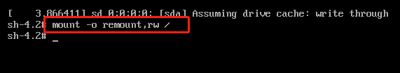 因为要修改文件,因此输入mount -o remount,rw /赋予读写权限(此时可以直接使用passwd命令修改root用户密码,本次不是忘记密码的问题,因此再描述):