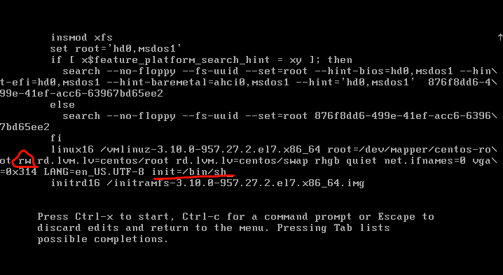 然后找到图中红线标注的该行,在行尾添加 init=/bin/sh 并将对应的ro权限改为rw权限。(这个原文并没有写,原文他的操作系统和我们的并不一样,但基本上都是标明了ro权限的)