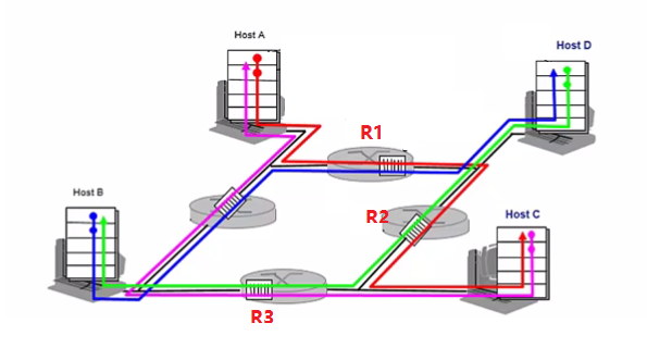 下面是一个因为拥塞丢包的例子:Host A通过红色的路线经过R1、R2发送给Host C,Host D 通过红色的路线经过R2、R3发送给Host B,如果在R2路由器发生了拥塞,导致Host A发送的数据包丢失了,那么Host A就必须重发并且R1的转发就浪费了。