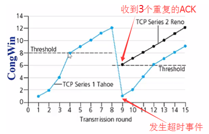 超时和收到3个重复的ACK对Threshold的处理是一样的,对CongWin的处理却不同。原因是因为可以收到ACK说明网络还有一定的传输能力,而连ACK都收不到,说明网络拥塞严重,顾降速幅度较大。