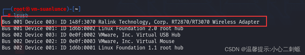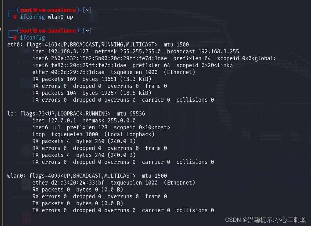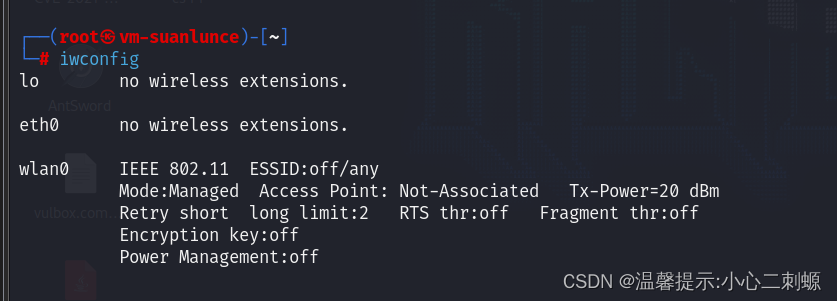 可以看到一个名字为wlan0的网卡,如果你是笔记本物理机这里应该有两个网卡,我这个是虚拟机所以之后一个waln0。可以看到我们无线网卡已经插入虚拟机并且成功识别。