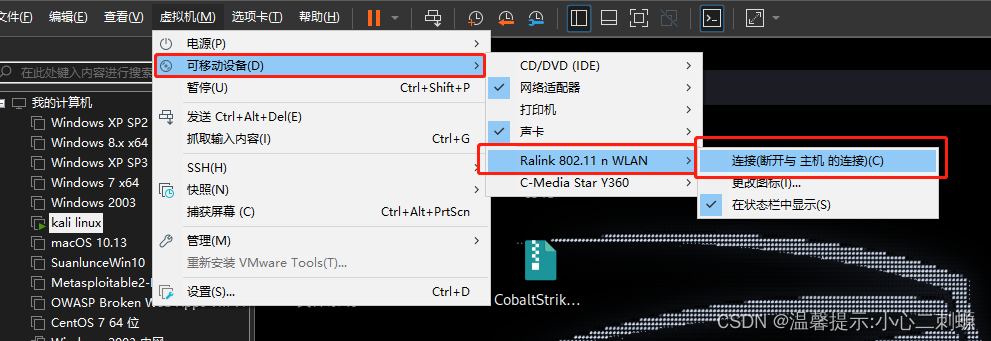 1.将你的无线网卡插入,再将你的无线网卡映射到虚拟机里面。