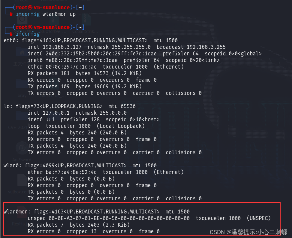我们可以看到 我们用命令添加了一个名字为wlan0mon的监听网卡,但是并没有显示出来,那是应为他没有启动我们要用ifconfig -a 来查看他是否成功添加。