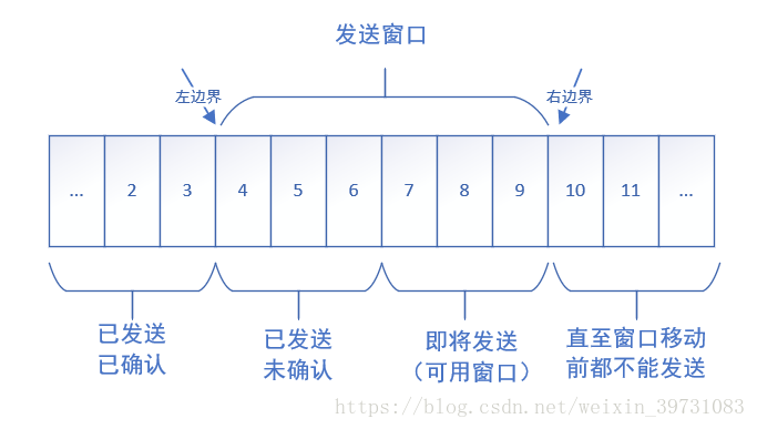 - 发送窗口:有三个术语用于描述窗口左右边界运动